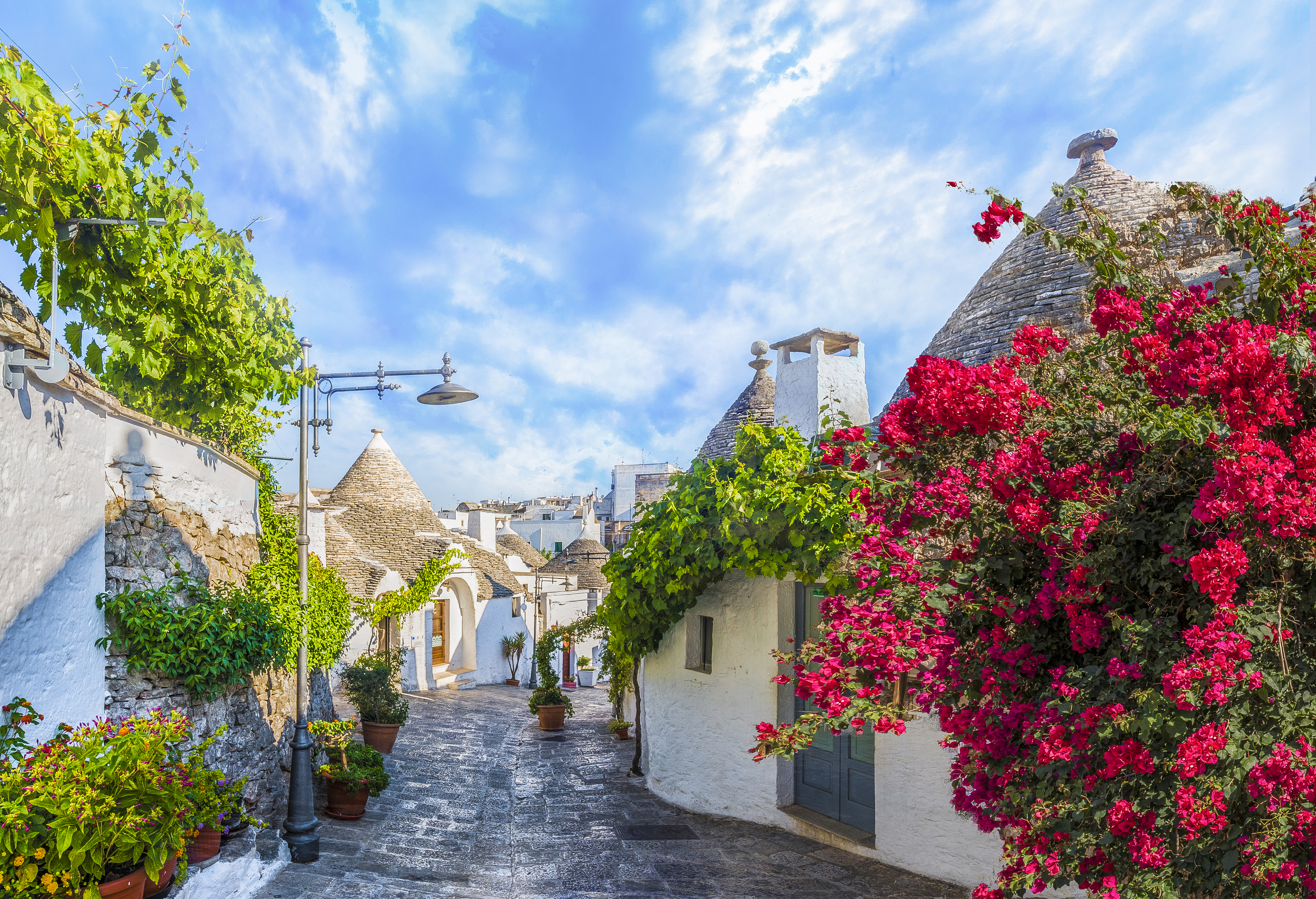 This morning we head to Ostuni. Visible for miles around, Ostuni is a gleaming tumble of painted buildings and dramatic brick-built palaces, perched on three hills and surrounded by olive groves. Ostuni’s whitewashed old town lends the town its second name as the ‘White City’ of Puglia, and there are few places as atmospheric found anywhere else in the region. Stroll through the narrow streets spanned by elegant archways or perhaps relax in a pavement cafe and just enjoy the views. We then continue through the countryside and the Itria Valley. Keep your eyes peeled for your first view of those unique hobbit-sized cone-roofed Trulli houses that look like they’ve come straight out of a fairytale book. Alberobello is the best place to see and visit the famous trulli houses, whitewashed cones made of stones held together, traditionally without mortar – there are over 1300 of them here.