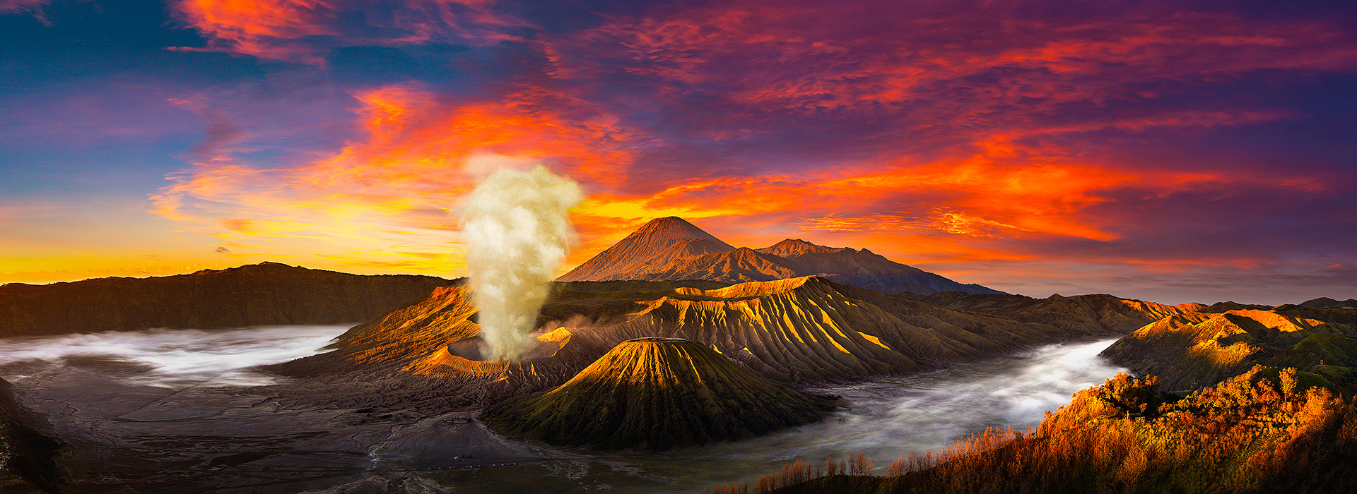 As you venture deeper into the region’s Bromo Tengger Semeru Nature Park at sunset. Stop first at Java’s famous ‘Sea of Sand’, an expansive sheet of volcanic ash covering the foothills of Mount Bromo. Watch as the light of the setting sun casts shadows over its dunes and ridges. After a brief photo stop, make your way to the verdant Coban Pelangi Waterfalls, where you can take a gentle stroll to its most impressive jungle overlooks, as you enter the National Park you will then swap your coach for a jeep.