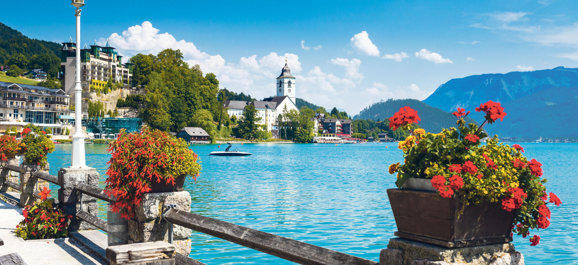 As the day progresses the scenery becomes ever-more spectacular. Following beautiful scenic routes alongside sparkling lake shores and through velvet green hill pastures brings us to the second lake of the day, the dramatic Traunsee and the picture postcard setting of the fishing village of Traunkirchen which until the last century could only be reached by boat. Leaving lakes behind for a short while, we pass through the picturesque spa town of Bad Ischl. Mountains and forest stretch in all directions as we head for St Wolfgang where there’s time for lunch amidst truly glorious scenic surroundings.